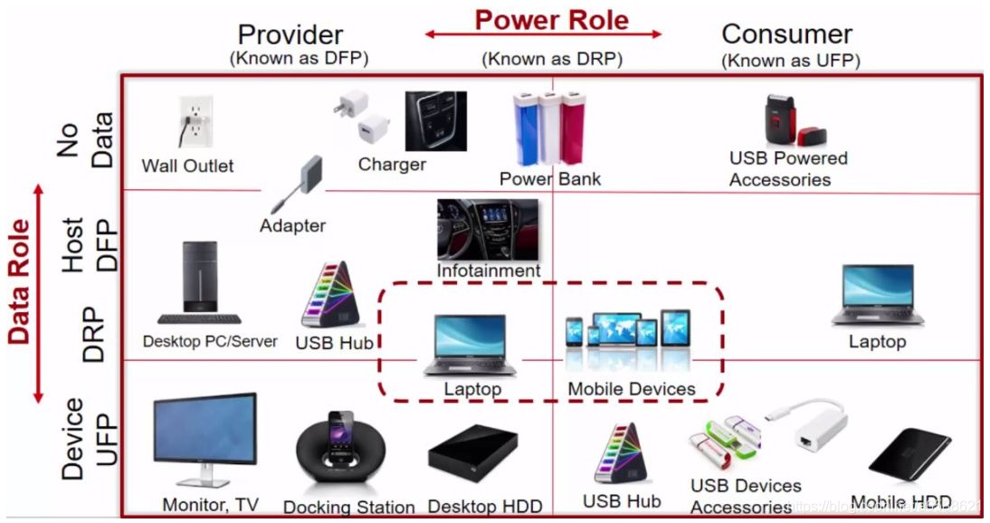 如下图显示常用设备的Data Role和Power Role