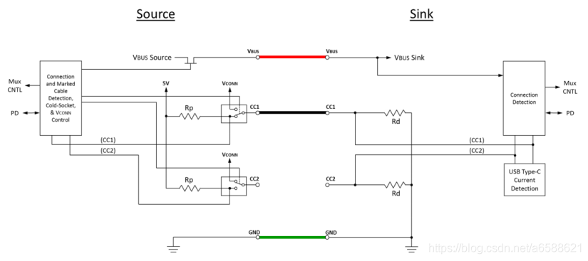 包含PD协议的Type-C 系统从Source到SINK的系统框图大致如下: