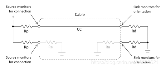 b)Source端CC1/CC2均上拉至高电平,同时检测是否有Sink插入,当检测到有Rd下拉电阻时,说明Sink被检测到。Rp的阻值表明Host能够提供的功率水平。