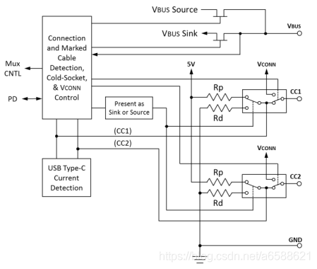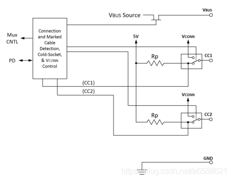 c)Source端根据Cable中哪一个CC引脚为Rd下拉,去翻转USB的数据链路,同时决定另外一个CC引脚为VCONN