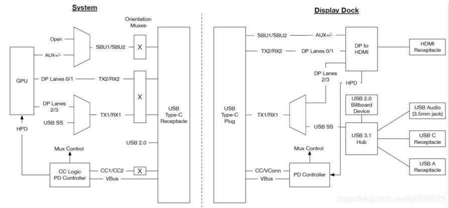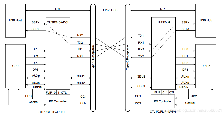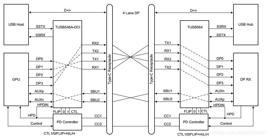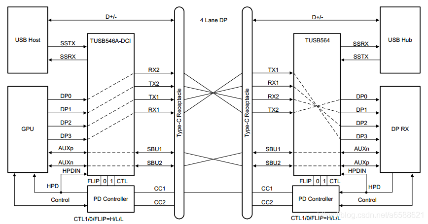 如下图,两端设备会根据插入方向,切换数据链路。图X插入连接为CC1,因此TUSB564切换到TX1/RX1