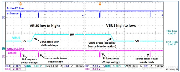 (5)在电压变化期间,SINK的电流会保持尽可能小,Source端VBUS到达9V并稳定之后,会发出Ready信号