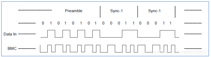 BMC码是一种单线通信编码,数据1的传输,需要有一次高/低电平之间的切换过程,而0的传输则是固定的高电平或者低电平。每一个数据包都包含有0/1交替的前置码,起始码(SOP),报文头,数据位,CRC以及结束码(EOP)