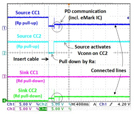 (1)电缆接通之后,Source的一根CC线被来自VCONN的1K拉低