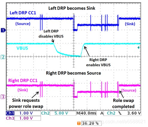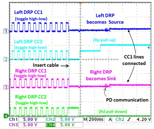 当设备为DRP时,设备的CC1和CC2为方波,一旦连接,CC端都会发生改变。