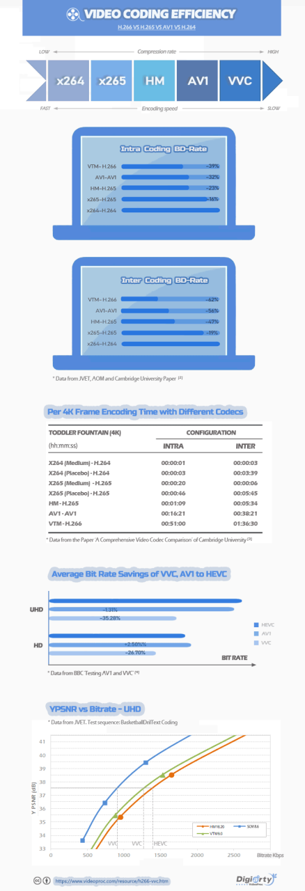 What makes the new standard H.266/VVC codec eagerly anticipated is that there is no further tradeoff between file size and quality compared with AV1, HEVC, etc. Namely, same size, better quality. Then what are the exact bit rate savings of VVC? How long does H.266 take to encode a 4K video? Authorities have made the test for us. Check the comparison of video coding efficiency (H.266 vs H.265 vs AV1 vs H.264) below.