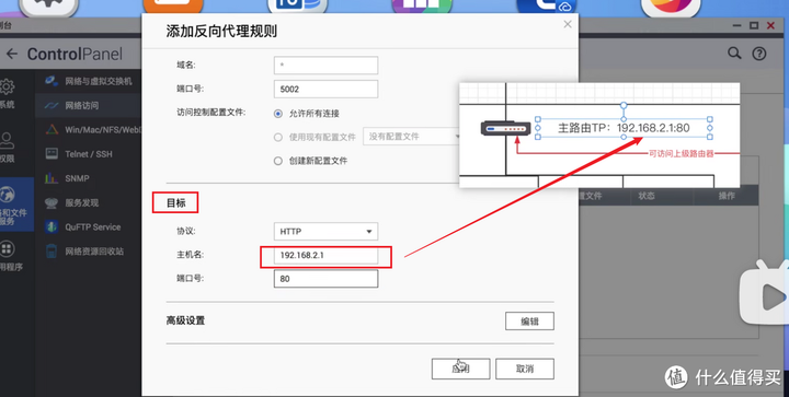 好的,如何用这台威联通NAS实现内网设备全远程访问呢,请看下图,同样,我主路由是192.168.2.1:80,就以这台内网设备来演示吧,其它更多设备可以按此公式套上去,或查看前面的群晖设置反向代理时的解释,两者的反向代理设置方法是一样的。