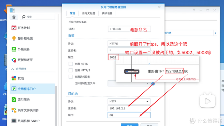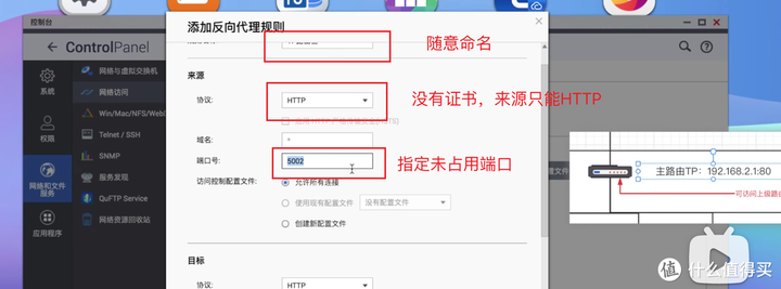 要想实现远程访问主路由:192.168.2.1:80,按以下设置。来源处,随意命名,来源协议只能HTTP,因为没有SSL证书,来源端口号就指定一个未被占用的。