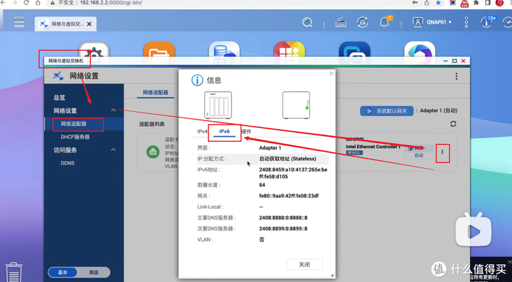 设置前,首先看看威联通NAS有没获取到公网V6,如下图操作,找不到的,就威联通中搜索网络与虚拟交换机,就看到了。确保能获取240x开头的V6地址,则可进入以下操作。