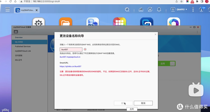 威联通内进入myQNAPcloud云服务,点击My DDNS,登录你威联通账号之类的,把My DDNS点击启用,会提示输入一个二级域名,我同样输入ikun007,点击确定。