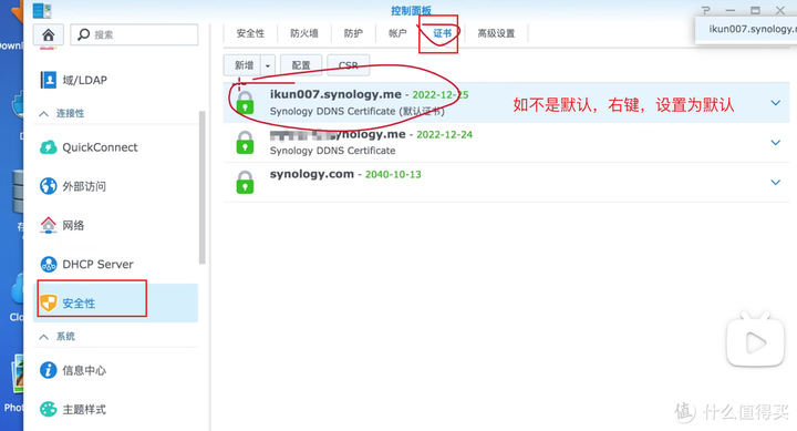 有了证书,当然要开启HTTPS访问啦,如下图操作,找到网络-DSM设置,勾选HTTPS之类的选项,群晖7.0可能设置不同,那你直接搜索https之类字眼找到这个设置就行了,各位随机应变,不要问我DSM 7怎么开HTTPS了,要善于变通哦,实在不行,百度。