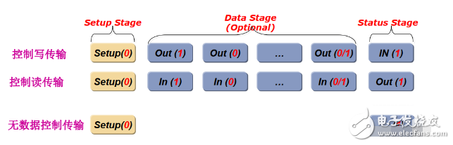 在控制传输中,为了实现完整的一次控制传输,一般由三个阶段组成:建立阶段、数据阶段(该阶段可能没有,由建立阶段的数据决定)、状态阶段,每一个阶段都由传输事务组成,即存在三个数据包的传输。