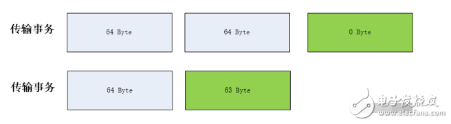 而如果要传输127字节,那么因为最后一个包不是满负载(只有63字节),所以也将认为数据传输完成。