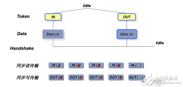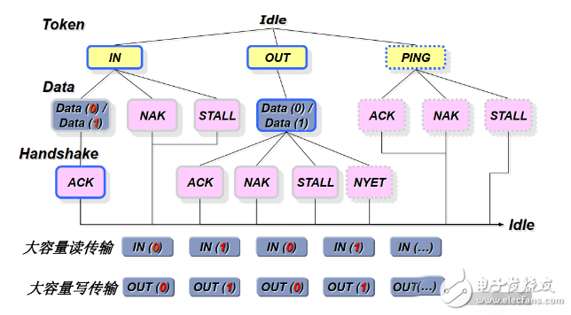 在状态阶段,一律使用DATA1进行回复,状态阶段的数据包中的数据为空,也就是说不携带任何数据。同时,根据建立阶段中的数据要求不同,比如要求发送数据或者接收数据,将使用相反的IN或OUT令牌完成状态阶段,比如建立阶段主机要求发送15字节到设备中,那么数据阶段将先使用OUT令牌发送数据,之后在状态阶段主机将使用相反的IN令牌获得空数据包。因为传输时,可能需要多次传输事务才能完成数据阶段。