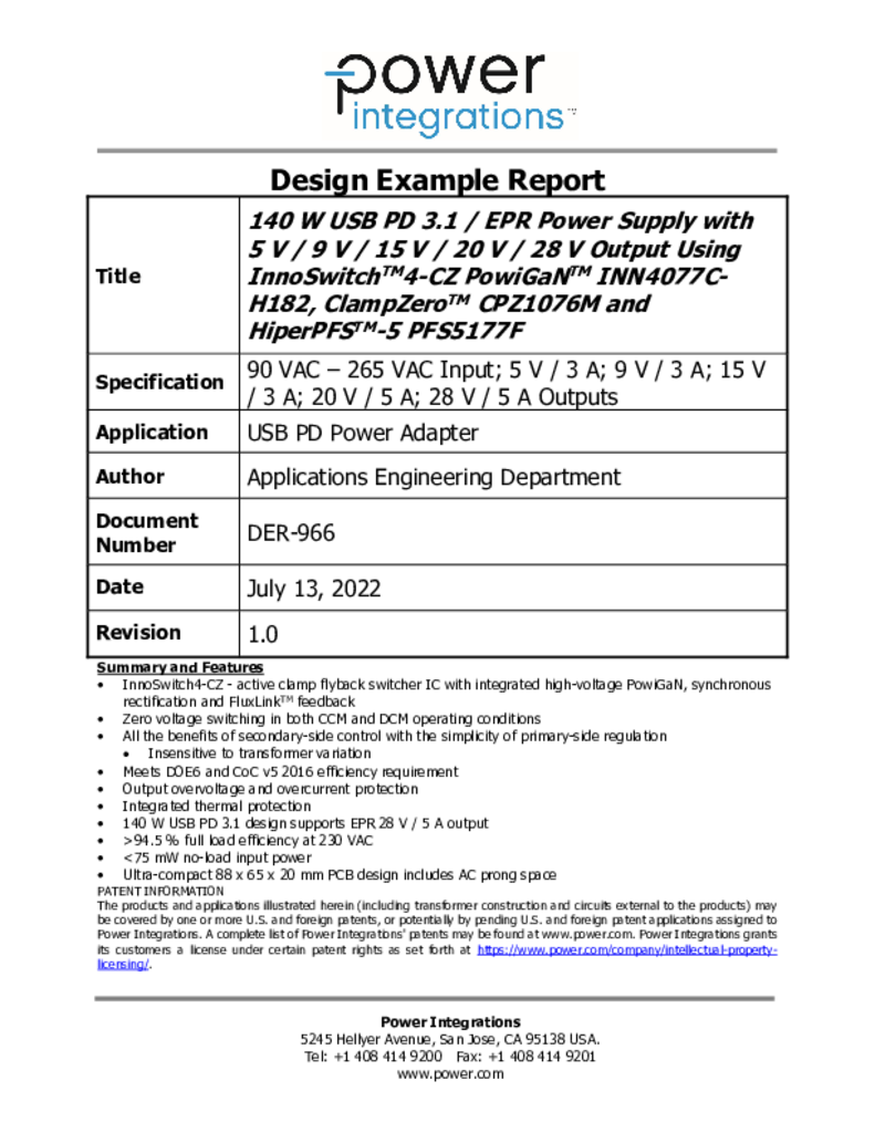 140 W USB PD 3.1 Extended Power Range (EPR) charger for mobile devices and laptop computers using three innovative PowiGaN-based ICs: