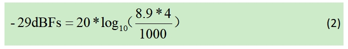 式(1)中Ref为1000 mV/Pa (1 V/Pa)。根据式(1)可知,-41dBV对应的灵敏度约为8.9mv/Pa,即经过该mic后,1Pa的声压会产生8.9mv的电压。有了该信息和前置放大器的增益,则可将mic经过前置放大的输出电平匹配至后续电路系统,进而作为ADC的输入。假设前置放大的增益是4倍,ADC后输出的数字信号满量程(0 dBFs)对应的电压是1V,那么该mic的灵敏度对应的数字信号的幅值约为 -29dBFs,计算公式为