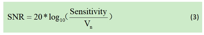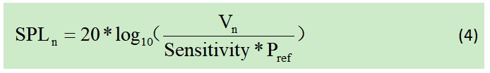 其中Vn为mic固有噪声引起的输出电压(V),Sensitivity为mic灵敏度(V/Pa)。国标^[2]^中描述固有噪声的指标为“固有噪声引起的等效声压级”,即无外声场时,仅由mic固有噪声引起的输出电压,可以看作能产生相同有效值输出电压所对应的外部声压级。等效噪声级的计算公式为