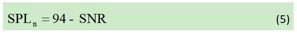其中SPLn为等效噪声级,Pref为参考声压2*10^-5 Pa。根据公式(3)和(4)可以推导出固有噪声引起的等效声压级与信噪比的关系为