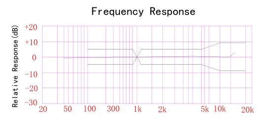 频响曲线描述的是mic的频率响应与给定用途的“理想”响应偏差不超过规定值所覆盖的频率范围^[2]^。图2.1给出的频率范围为50 ~ 16K Hz。规格书中的一种频率响应的曲线如图2.2^[1]^所示。从语音信号处理角度来看,希望频响曲线越平坦越好,平坦的频率范围越宽越好。