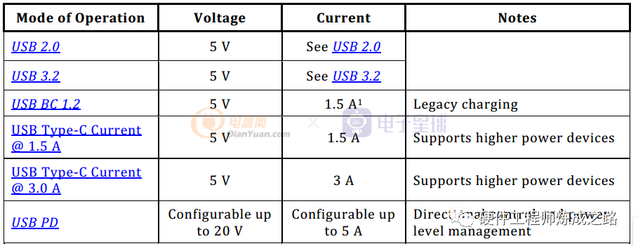 USB PD各个模式供电能力如下表: