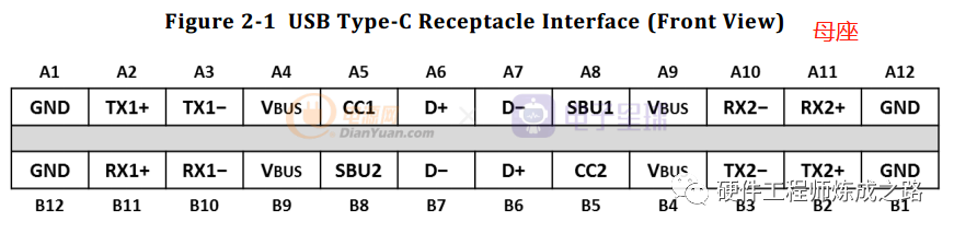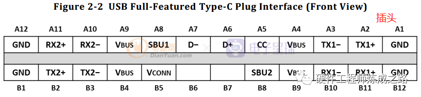 USB 2.0数据线,D+/D-。它们在插头端只有一对,和旧的USB 2.0规范一致。但为了支持正反随意插。在插座端定义了两组,这样插座端可以根据实际情况进行合适的mapping。