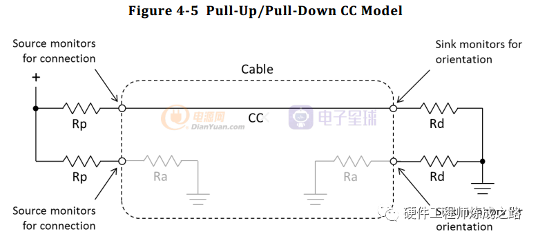 如下图,Source端是上拉电阻,Rp,Sink端接下拉电阻Rd