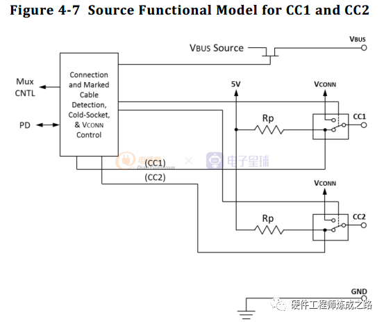Source端根据Cable中哪一个CC引脚为Rd下拉,去建立正确的USB高速数据路由,同时决定另外一个CC引脚提供VCONN