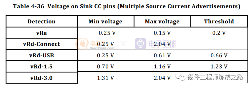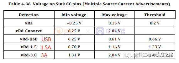在Sink与Source连接后,因为Rp与Rd分压的原因,Sink端的CC的电压范围如下表: