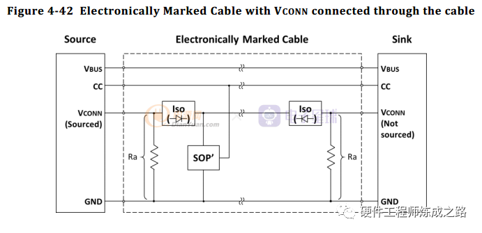 一种典型的电子标记电缆如上图。隔离元件(Iso)应防止Vconn通过电缆的端到端Ra电阻的作用是高速Source端,本电缆需要用到Vconn。