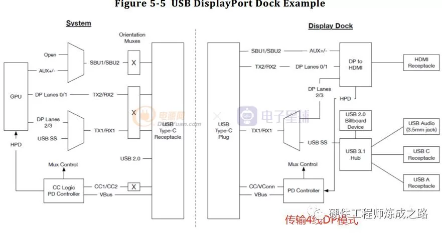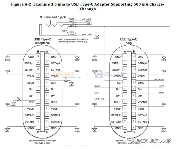 3.5mm音频接口可以转Type-C端口,USB2.0数据通道传输模拟音频信号,音频右声道接DP,音频左通道接DN,MIC信号则连接在SBU引脚上,在这个模式当中,电源可以提供到500mA电流。